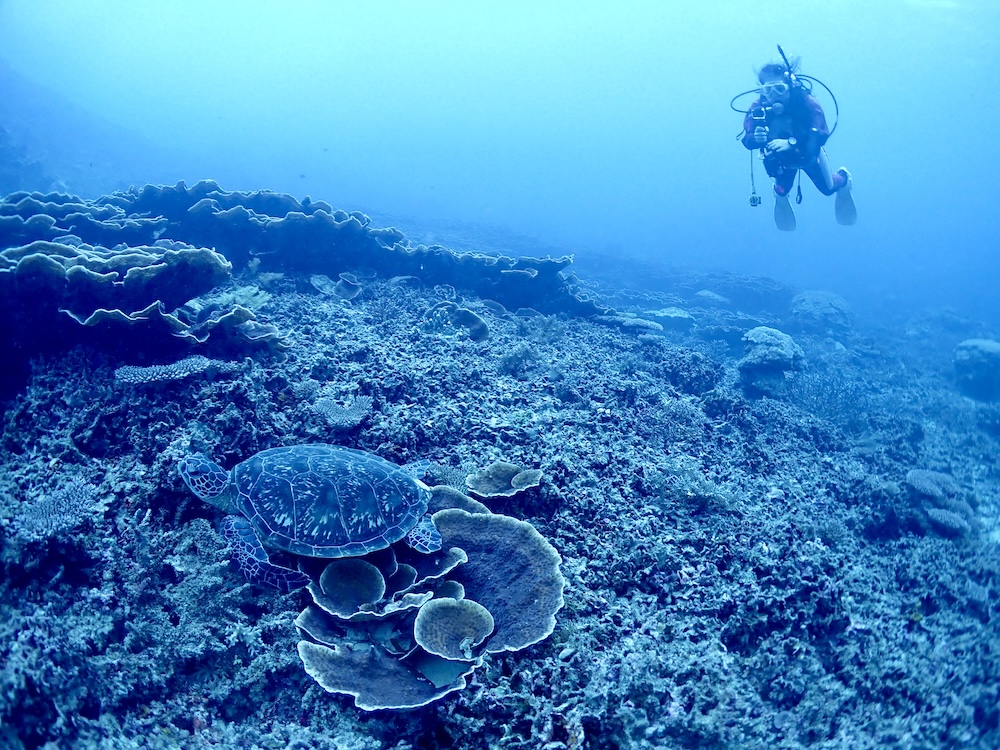 しかもまたまたカメがサンゴの上でおやすみしていました![]()