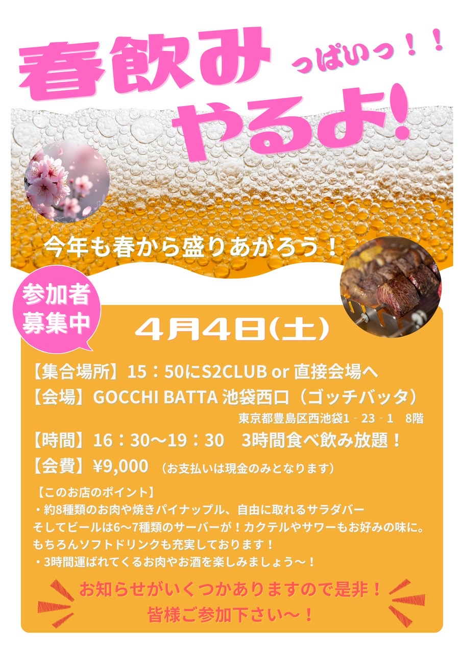 4月4日(土)16時30分~ 春飲み(開催決定/残席わずか!)